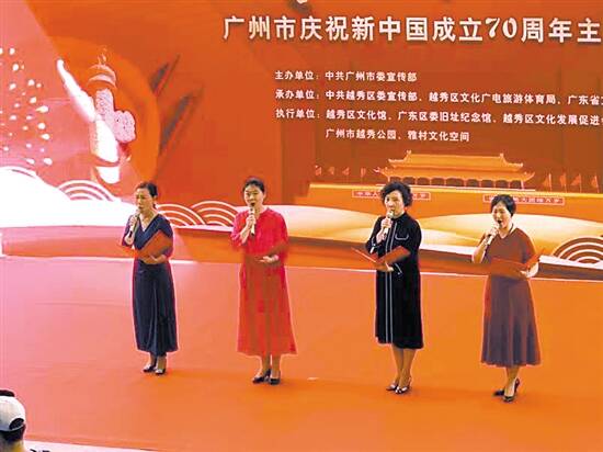 新快报讯 记者邓毅富报道 10月6日上午,由中共越秀区委宣传部、越秀区文化广电旅游体育局、广东省文化学会联合主办的“我和我的祖国——庆祝新中国成立70周年主题朗诵会”在广州寓言文化广场举行。整场朗诵会以时间为轴线,朗诵者们深情地诵读了《可爱的中国》《祖国啊,我亲爱的祖国》等红色经典篇章。中共广东区委旧址纪念馆馆长高向慧在朗诵了杨匏安所写的《红色印记——一封家书》后表示,中共广东区委旧址纪念馆里发生的故事很多市民了解不多,希望借着活动能够向大家推荐这座纪念馆,让更多市民朋友能够走进纪念馆了解历史,并且希望能告诉大家,跨越了70年的历程,中国共产党人始终不忘初心,一直在砥砺前行。毛小容、钟南、张文君、王忠琴朗诵了《祖国啊,我亲爱的祖国》。来自广州体育学院的刘阳和广东财经大学的郑国豪一同朗诵了《歌唱祖国》。广东省文化学会演讲与朗诵专业委员会总顾问、广东省“最美阅读声音”奖获得者牧言带来了李本深的作品《丰碑》。在互动环节,牧言老师带领观众们一同参与朗诵并给予了专业建议。