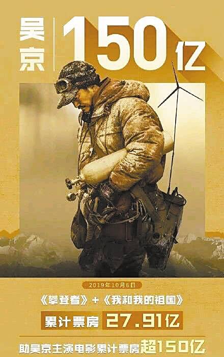 新快报讯 截至10月6日,国庆档大片合力狂砍46亿元票房,远超去年国庆档票房总和,掀起了一波全民观影热潮!《我和我的祖国》总票房高达20.53亿元稳居国庆档第一名,《中国机长》总票房达到了17.95亿元。其中,《攀登者》+《我和我的祖国》累计票房27.91亿元,这也使得吴京主演电影累计票房超150亿元!也是目前中国电影市场10位百亿影人中第一位达到这一票房高度的演员。