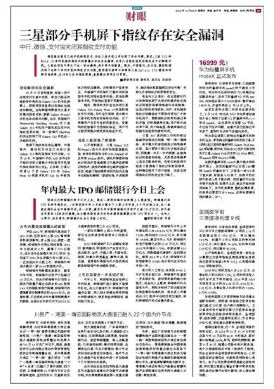 因屏下指纹存在安全漏洞,中国银行、微信和支付宝已关闭三星Galaxy S10等机型指纹支付功能。10月19日,中国银行手机APP发布《关于临时关闭三星部分手机型号手机银行指纹服务的公告》。公告称,三星公司承认了其Galaxy S10和Galaxy Note 10两款手机和Tab S6平板指纹识别存在漏洞。为保障用户登录安全,中国银行手机银行已暂时关闭该型号手机的指纹登录功能;其他品牌型号手机、平板指纹登录不受影响。