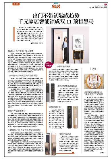 嘴上说不买,清醒过来时钱已经付完了,双11预售正在进行中,购物车除了塞满了衣服、化妆品等,不少人还给自己的家来点惊喜。天猫最新数据显示,截至11月6日,共有5.4万件智能门锁接替了传统的“铁将军”。这两三年越战越勇的智能门锁,市场发展空间与购买力有着不俗的上升潜力,而千元智能锁已成为购物节的主战场。■新快报记者 何璐诗
