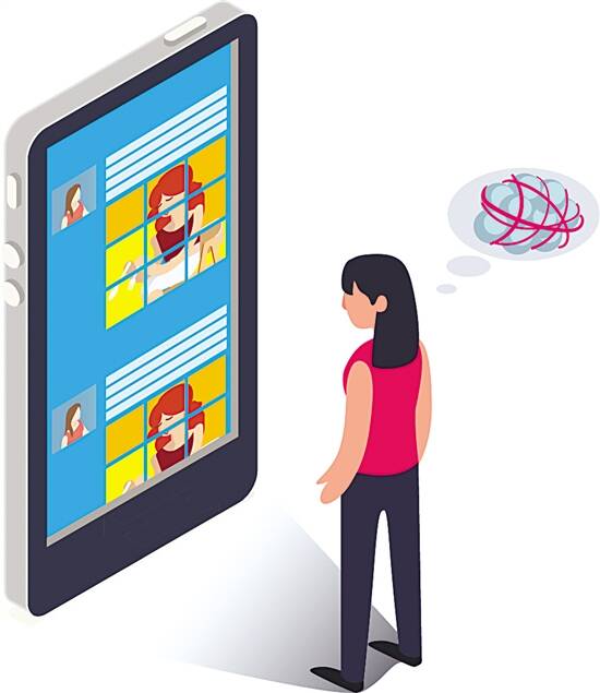 电子设备带来便利的同时也带来了焦虑。《绿皮书》显示,在参与调查的1199名的职场女性中,近四成表示移动电子设备的使用让她们更加疲惫,并且对移动电子设备所承载的过量信息感到压迫;另有26%的女性会因朋友圈他人的光鲜而感到焦虑。另外,使用移动电子设备时间越长,出现“是不是感到焦虑或抑郁”或“总是处于焦虑或抑郁状态中”的概率越大。