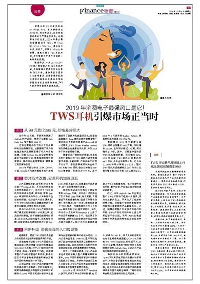 苹果今年10月底发布的AirPods Pro,官方售价高达2399元,到目前为止,在全球范围内都处于严重缺货状态。在消费电子行业里,2019年最火爆的话题莫过于TWS(即True Wireless Stereo,真无线立体声)耳机了。苹果AirPods的热销,彻底引爆了TWS耳机市场,并引领整个声学产业链新一轮的成长机遇。随着华为、小米、vivo、OPPO等厂商纷纷入局TWS耳机市场,并陆续推出更具性价比优势的TWS产品,叠加受益于蓝牙5.0标准普及、当前智能手机的主流设计趋势以及集成丰富的智能语音交互功能的推动,TWS耳机市场有望迎来快速发展。