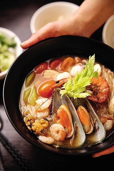 1.锅中加水(300ml左右)煮开,放入冬阴功酱料(超市有售)、淡奶和柠檬片略滚几分钟;