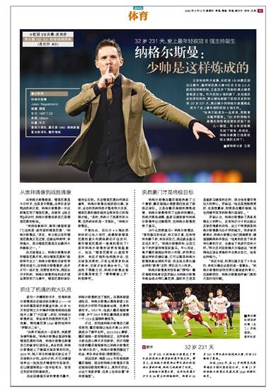 ●欧冠1/8决赛·次回合 莱比锡RB 3∶0 托特纳姆热刺 (总比分 4∶0)北京时间昨天凌晨,在欧冠1/8决赛次回合比赛中,德甲球队莱比锡RB在主场3∶0大胜托特纳姆热刺,主客双杀了热刺的莱比锡昂首挺进8强。作为欧冠8强的新丁,在创造队史纪录的同时,莱比锡也刷新了欧冠历史的纪录:32岁231天,莱比锡少帅纳格尔斯曼就此成为了史上最年轻的欧冠8强主帅。