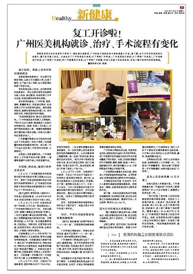 [想做医美项目的求美者终于等到了!新快报记者获悉,广州的医疗美容机构日前陆续复工开诊。据了解,由于天河区医美机构比较集中,属于较早复工的区。记者走访了广州华美医疗美容(以下简称广州华美)、广州美莱医疗美容(以下简称广州美莱)、广州海峡医疗美容(以下简称广州海峡)和广州紫馨医疗美容(以下简称广州紫馨)四家已经复工的医美机构,实地了解开诊情况和防控措施。■新快报记者 梁瑜]