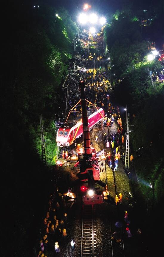 据介绍,广铁集团组织了1000余人全力抢修京广铁路郴州段塌方线路,加快对脱线的车厢起复,并对大约380米受损钢轨进行更换。