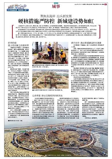 [人勤春来早,奋进正当时。鮀城之滨,“复工曲”铿锵有力,东海岸新城初具规模,一幅宏伟的画卷徐徐展开。面对新冠肺炎疫情,中交汕头投资公司(下称中交汕头公司)快速反应,早早制定防疫生产“要诀”,用“硬核复工”保障项目建设,让重点工程项目按时保质推进。东海岸新城位于汕头东部海岸,西起海湾大桥,沿海岸线东至澄海区莱芜岛,规划总面积约24平方公里,总投资约260亿元。该项目是汕头市与中国交建进行战略合作的大型城市综合开发项目,也是中国汕头华侨经济文化合作试验区(下称华侨试验区)的核心区和直管区。