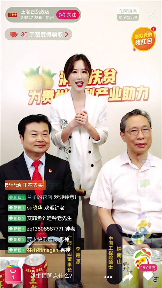 新快报讯 记者梁瑜报道 昨日下午,中国工程院院士、国家呼吸系统疾病临床医学研究中心主任钟南山和广药集团董事长李楚源共同进入网上直播厅,开启了一场别开生面的王老吉刺柠吉带货直播,与此同时,广药王老吉2亿元扶贫消费券正式上线。记者看到,钟南山助阵直播的1小时内,累计超过258万人次观看,超过835万人次点赞。截至28日当晚,已售出王老吉刺柠吉复合果汁饮料超过2万箱(每箱12罐)。新快报记者观察到,钟南山一上线,直播厅在线人数就直线飞升,主播和网友亲切地称呼钟南山院士为“男神”。钟南山、李楚源和淘宝主播组成了“直播天团”,向网友介绍刺梨、刺柠吉等,科普维生素C对提高免疫力的作用,以幽默、轻松的语言与线上观众进行直播互动。世界羽毛球女子冠军谢杏芳也通过隔空连线的形式,介绍居家抗疫期间的居家运动、健康料理等小技巧,引爆线上人气。