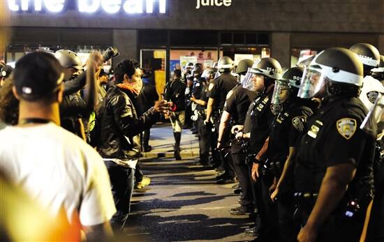 ■5月31日,在美国纽约联合广场附近,警察与抗议者对峙。 新华社发