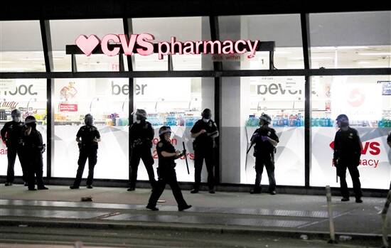■5月31日,在美国纽约,警察在一家被抗议者破坏的超市外警戒。 新华社发