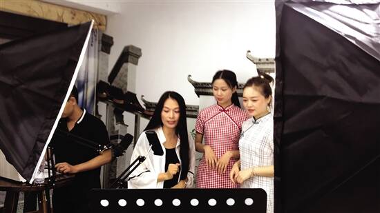 ■入驻五号服装小镇的一家服装企业的网红主持人正在直 播带货。