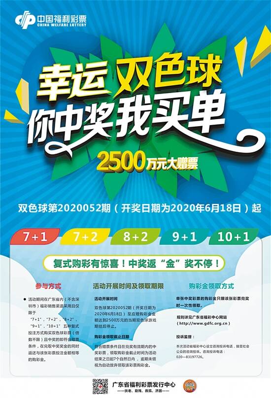 提醒彩民的是,广东福彩双色球“你中奖我买单”活动在全省(深圳除外)火热进行中,彩民只需采用了“7+1”“7+2”“8+2”“9+1”“10+1”等符合活动条件的复式投注,中奖后可获购彩金全额返还。