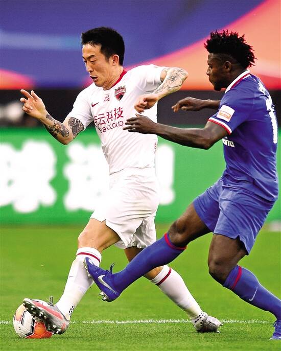■深圳佳兆业队球员姜至鹏(左)在比赛中带球进攻。新华社发