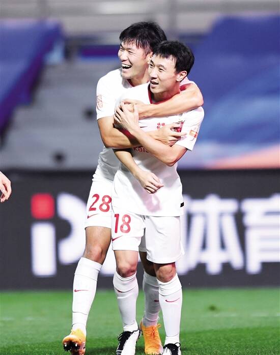■深圳佳兆业队球员徐洋(右)在进球后与队友李源一庆祝。新华社发