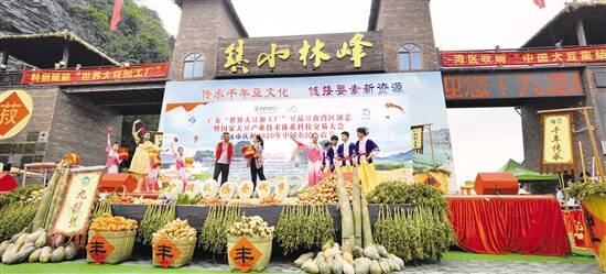 3000多亩金黄的大豆进入丰收季,客家姑娘端出来的“豆腐四季全宴”惊艳亮相,来自天南海北的280多种豆制精品令人眼花缭乱……9月22日,一场别开生面以大豆为“主角”的庆祝2020年中国农民丰收节活动在广东清远英德市九龙镇峰林小镇拉开帷幕。广东省农业农村厅副厅长黄斌民、广东省妇女联合会副主席杨佳、清远市副市长雷玉春,以及相关单位领导、专家、企业家等社会各界代表参加了盛会。会上,“湾区豆腐小镇”正式落户峰林小镇,并现场举行了奠基仪式。
