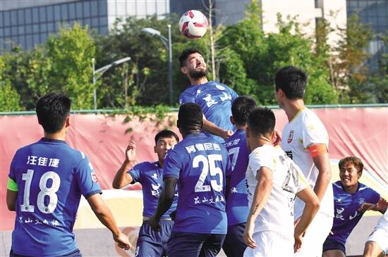 ■10月11日,昆山FC队球员皮里(上)在比赛中争顶头球。新华社发