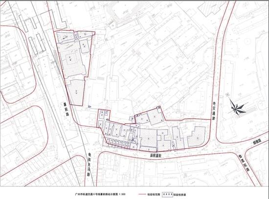 广州市轨道交通十号线署前路站示意图 署前路 寺贝通津 烟墩路 庙前直街 恤孤院路 龟岗大马路 拟征收范围 拟征收房屋 ××××