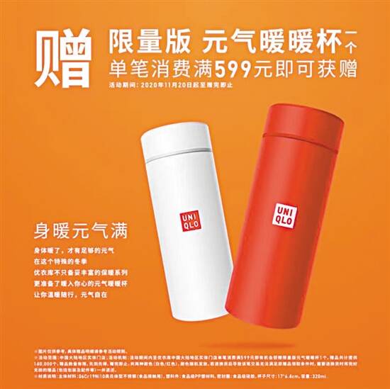 ●11月20日起,温暖季开启,温暖随行,暖身暖心,在优衣库全国实体店会员单笔消费满599元,即可获赠元气暖暖杯1个,红白两色可选;