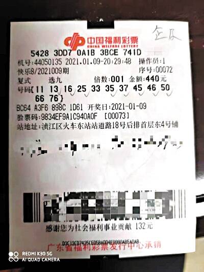 新快报讯 记者陆妍思 通讯员邓永拓报道 1月9日,“快乐8”第21009期开奖,韶关中得1注“选9中9”。经检索,这张幸运的彩票由韶关市浈江区火车东站站道路18号首层东4号铺的44050135投注站售出,中奖彩票是一张440元的“12选9”复式票,除了中得1注“选9中9”30万元大奖,还中得一连串小奖,共收获奖金37.72万元。