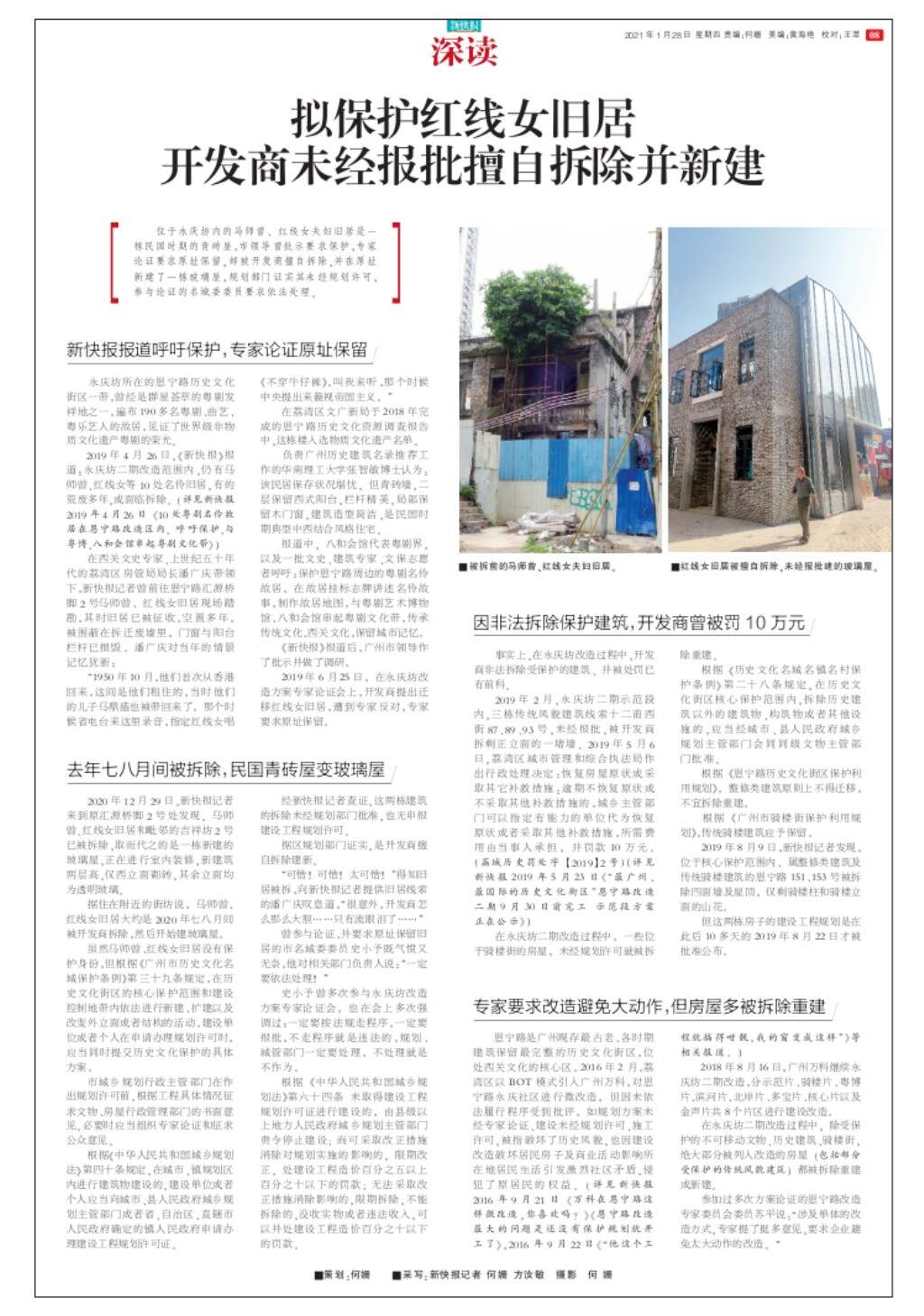 拟保护红线女旧居 开发商未经报批擅自拆除并新建