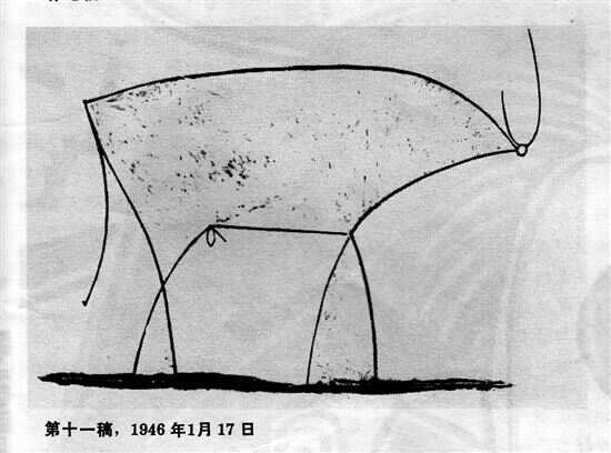 最后一稿,毕加索用屈指可数的几根线条,创作出了史上最经典的牛,毕加索在创作的过程中,不断思考的是,到底是什么因素使得我们仍然认为那是一头牛,尽管前后变化已经天渊之别,这也为美术史留下了一个重大的课题,视觉符号的复杂与简化的意义。