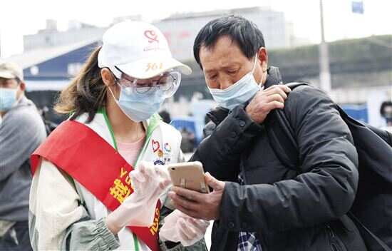 ■志愿者在广州火车站广场帮助乘客登记健康码。(资料图) 新华社发