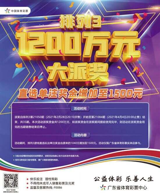 该活动在排列3第21050期(2021年2月28日20:10开售)开始至第21084期(2021年4月4日20:00止售)结束,共35期。派奖期间,排列3游戏直选玩法单注奖金由原来的1040元增加至1500元。本次活动仅限广东省内体彩投注站参与,派奖资金共1200万元,如果派奖资金在派奖期间提前使用完毕,则活动在派奖资金用完的当期销售结束后停止。