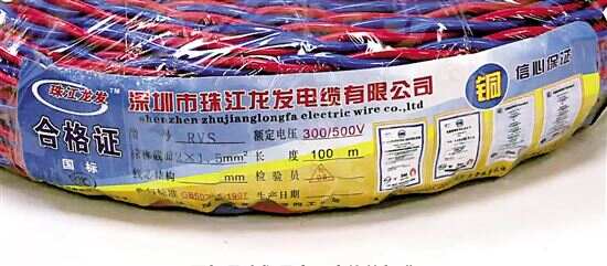 在广州番禺南方沙溪五金酒店用品城,雅电电器批发部销售人员告诉记者,店里售卖“国标”和“非标”两种电线。一卷2×1.5mm2的“非标”电线价格为75元,而一卷有“国标”的南村缆为160元。销售人员向记者解释,“国际”是符合国家标准的,“非标”是不符合国家标准,质量有好有坏,价格相对便宜,还可以根据客户需求订做。比如说一卷深圳珠江龙发的2×1.5mm2花线,标签注明是一卷100米,但实际只有80米。