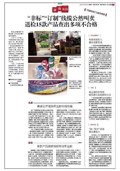 今年“3·15”前夕,市场监管部门联合记者暗访广州、佛山两地多家五金批发市场发现,一些电线电缆商家公开宣称产品分“国标”和“非标”出售,甚至可以提供“私人订制”服务,电缆标签上的规格和型号“可以随便写”。记者随机购买和送检15款产品,结果发现多个产品不合格。
