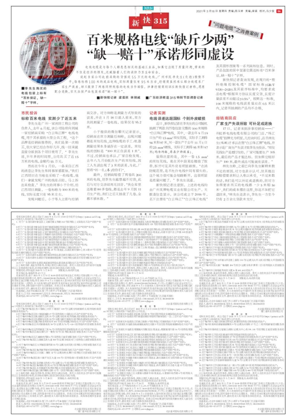 百米规格电线“缺斤少两” “缺一赔十”承诺形同虚设