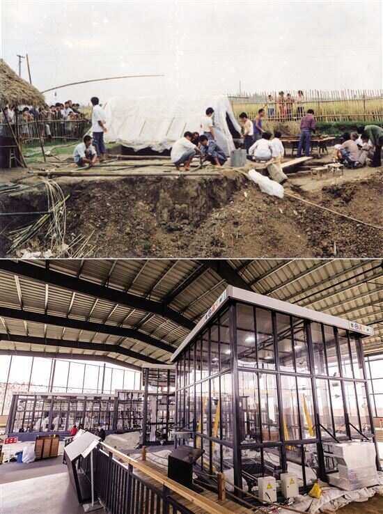■上图为1986年,考古人员在三星堆遗址考古发掘现场工作。受限于当时的条件,现场裸露在空气之中,没有被完全封闭保护起来(三星堆博物馆供图);下图为3月10日在三星堆遗址考古发掘现场拍摄的4个大小不同的“考古舱”。 新华社发