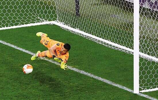 ■比利亚雷亚尔队守门员鲁利在点球大战中扑出点球。