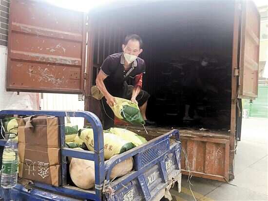 新快报讯 记者潘芝珍 通讯员梁美美报道 互帮互助,爱出爱返。6月12日15时许,一辆载满大米、鸡蛋、南瓜、茄瓜等农产品的货车到达广州环城高速公路入口,与早已在此等候的广州封闭区工作人员会合,在警车的带领下,物资车顺利到达荔湾区中南街道海中村,由群防共治小组分派到居民家中。