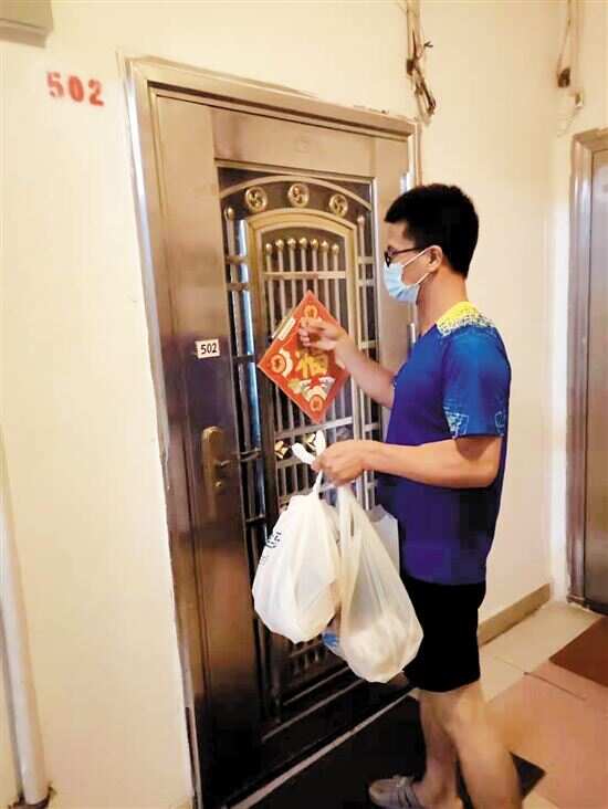 送菜先锋一点都不易做:要抱着几十斤重的配送箱子,爬楼梯、行走廊,每送一次就要爬28层楼,配送住户43家。为了实现食物领取零接触,在派送的时候,要挨家挨户地按门铃。铃声响后,待居民有开门领取的动作后,要再将每袋包装完好的菜式套餐悬挂在大门的扶手上。居民领走菜品后,才转移到下一户人家进行派送。