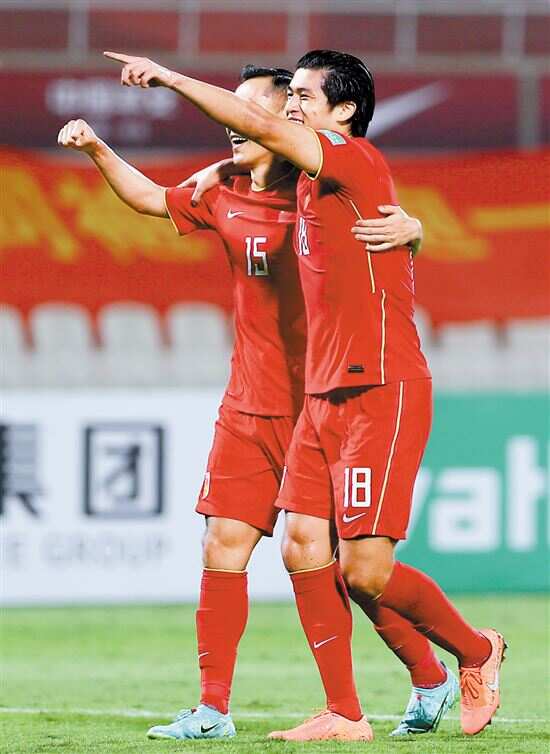 ■6月15日,在和叙利亚的对战中,张玉宁(右)进球后与队友吴曦庆祝。新华社发
