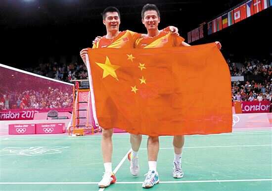 ■在2012年伦敦奥运会羽毛球男双决赛中,广东选手傅海峰(左)搭档蔡赟获得冠军。