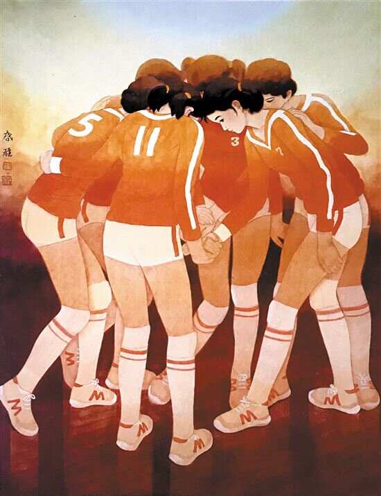 在1984年举办的第六届全国美展上,“女排精神”出现在多个画种中。例如徐启雄描绘女排姑娘上场前围作一圈击掌加油场景的中国画《决战之前》,李慕白与金雪尘合作的年画《女排夺魁》,则刻画了一位站在国旗下,绽放出胜利者微笑的女排姑娘。朱达诚雕塑《热泪》表现了女排姑娘艰难拿下关键一分后,在场上围成一圈,蹦跳着、叫喊着,流下热泪的激动瞬间。“美术工作者们用自己的作品,从不同角度表现、传递‘女排精神’,突破时空,凝固历史,为新中国体育题材美术留下了闪烁着金色光芒的记忆。”齐喆说。