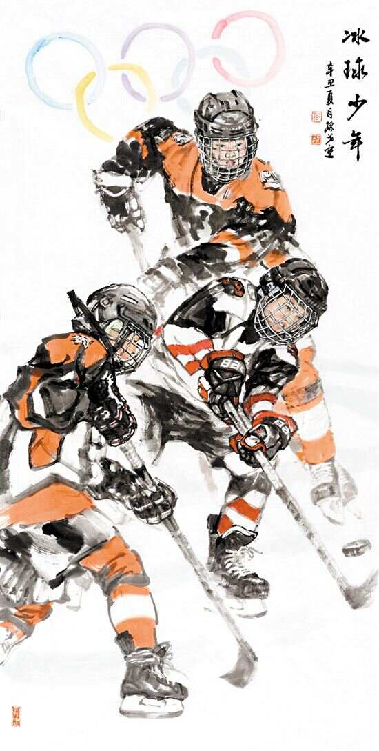 这次为“2020(东京)奥美大会”和冬奥会创作,让我的思绪又回到了那“水深火热”的艰苦训练生活,更加敬佩运动员敬业拼搏的职业精神。冰球是个激烈的运动项目,那种加上冰上速度的冲撞,真的像打仗一样,没有一个健壮的体魄和拼搏精神,是无法取得成绩的。创作这幅《冰球少年》是想从构图上强化运动感,表现比赛场的激烈争抢。从少年冰球这个角度,引申出中国冰球的发展前景。