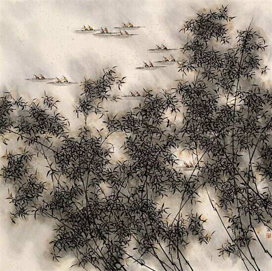 为参加此展,我创作了一幅以体育运动为主题的作品《清江晓发》。在素材上我选取比较擅长的墨竹作为主景,但墨竹比较清雅,这类作品难以在大展上突围而出,所以我唯有在图式上做文章,力求强化画面的视觉张力和动感,以突出体育运动的特性。画幅采用现代感较强的偏满构图正方形,画面上,前景一片竹林采取类似山水画的碎叶处理手法,只强调动感的形态。晨风吹拂,竹竿摇曳,似紧拉着的一张张箭弓。江中,晓雾未开,一艘艘划艇以脱箭之势,奋力前行,以体现运动员刻苦训练,你追我赶的紧张场景。
