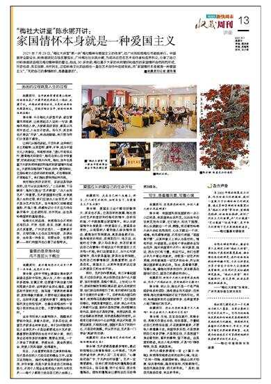 陈永锵:爱国主义这个题目好像很大,其实也不是。它是自然的流露,梅社因为对艺术的爱好和对梅花的情怀,自然而然地,个中就流露出家国情怀。我认为家国情怀本身就是一种爱国主义。爱国是由衷的。从前陈树人看到鱼儿游泳愉快自在,感慨当时军阀混战,真是连鱼都不如,鱼尚能安乐相处;走难至四川,他又说,此地村庄宁静、家人均在身边,我怎好意思说自己在蒙难?你能说这个和爱国主义无关吗?不能。我们说爱国主义,为什么叫家国情怀,因为家是基础,家是社会的细胞。先把自己的事情做好,是最重要的,这不是自私。爱国主义,从某种角度来说应该从热爱自己的生命开始。