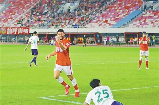 ■昨日,中超第一阶段A组比赛全部结束,广州、深圳、广州城分列小组二到四位,全部进入争冠组。图为广州队球员艾克森在对阵青岛队的比赛中成功上演“帽子戏法”。新快报记者 毕志毅/摄