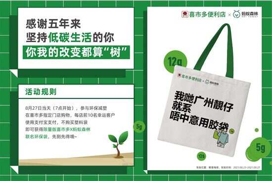 店内服务员向记者介绍,这是蚂蚁集团为庆祝蚂蚁森林上线5周年,与知名便利店品牌喜市多联合在广东便利店率先试点推出的“购物免塑获绿色能量”活动,具体是指从8月27日起在喜市多购物时使用支付宝支付,选择不购买塑料袋,即可获得12g蚂蚁森林绿色能量,每店前10名幸运客户还能获得限量版“喜市多X蚂蚁森林”联名环保袋,藉此鼓励市民少用塑料袋,做个绿色行动派。
