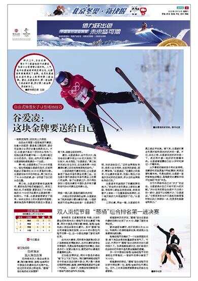昨天上午,自由式滑雪女子U型场地技巧决赛在张家口云顶滑雪公园打响。人气选手谷爱凌前两轮发挥出色,比赛结束前就锁定了金牌。这是谷爱凌在本届冬奥会上取得的第二枚金牌。赛后,谷爱凌表示,第一枚金牌已经送给外婆,所以第二枚金牌要送给自己。