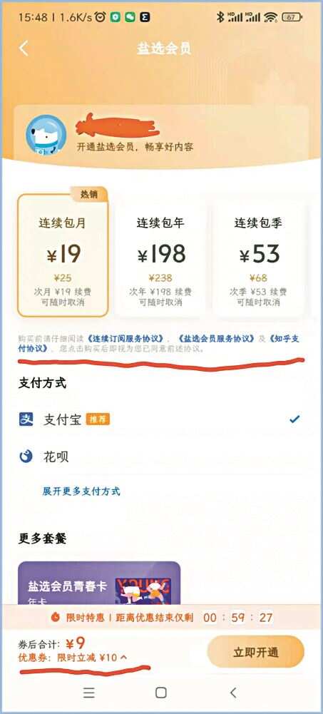 “知乎盐选会员首次开通9块。商家恶意引导客户说在知乎App上就能关闭自动扣费,我在知乎客户端早就关闭了自动续费功能,实际上我的支付宝一直每个月都在扣费,没有任何的提醒。”