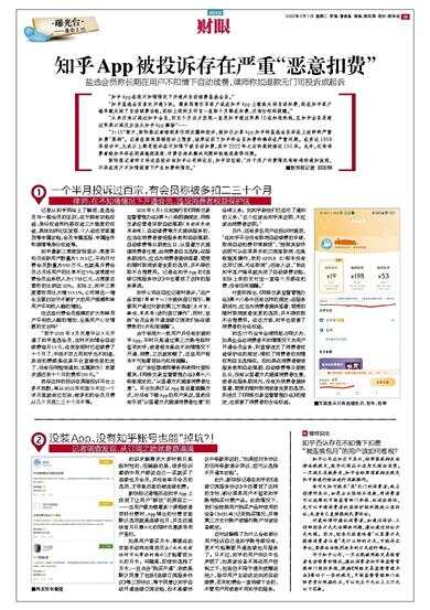 新快报记者昨日将这些投诉向知乎公司转达后,知乎回应称:“对于用户付费情况有标准的通知流程,不存在用户不知情提前下产生扣费的情况。”■新快报记者 郑志辉