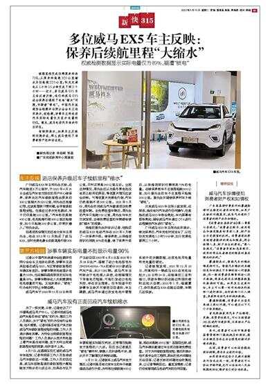 珠海的黄先生则告诉记者,他购买的威马EX5电动汽车在2021年5月做了一次保养升级。做保养前,从珠海到深圳约消耗30%的电量,做了保养升级后,从珠海到深圳约需消耗70%的电量。在做保养前车子总里程能跑300公里,如今黄先生的车子总里程只能跑200公里。黄先生怀疑做保养时车子被“锁电”。