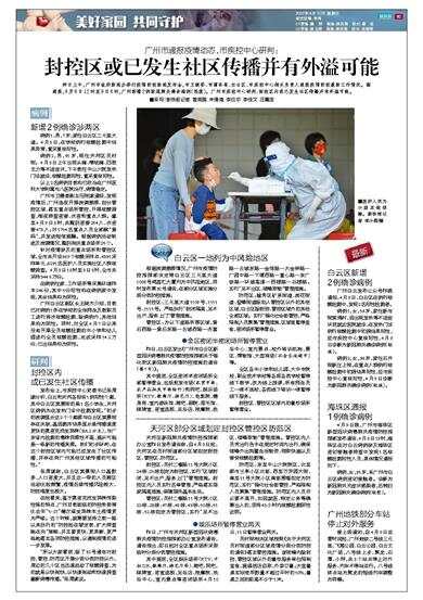 昨日上午,广州市政府新闻办举行疫情防控新闻发布会,市卫健委、市商务局、白云区、市疾控中心相关负责人通报疫情防控最新工作情况。据通报,4月8日12时至9日8时,广州新增2例新冠肺炎确诊病例(轻型)。广州市疾控中心研判:封控区内或已发生社区传播并有外溢可能。