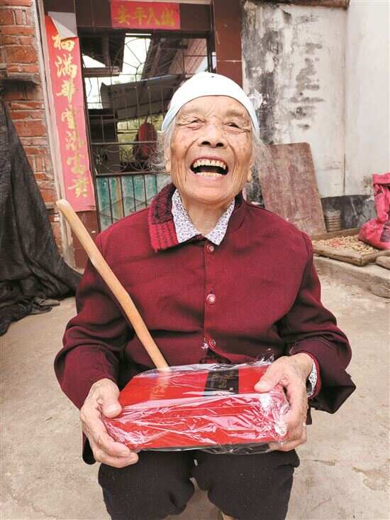 ■脱贫户领到爱心保健品,露出开怀的笑容。