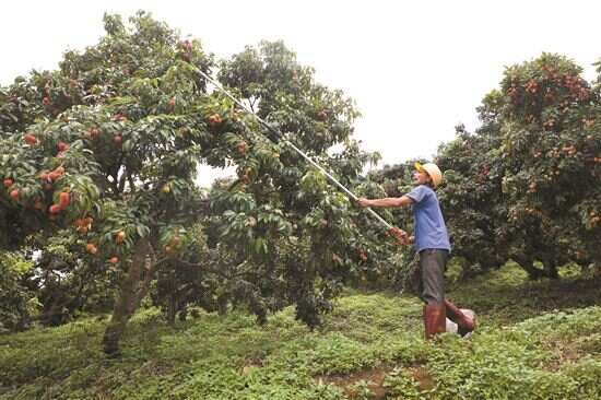7月5日,在广州增城仙进奉荔枝省级现代农业产业园,农人在采摘荔枝。据介绍,仙进奉已经成熟,今年产量是去年的3倍,售价与去年差不多。 ■新快报记者 林里/摄