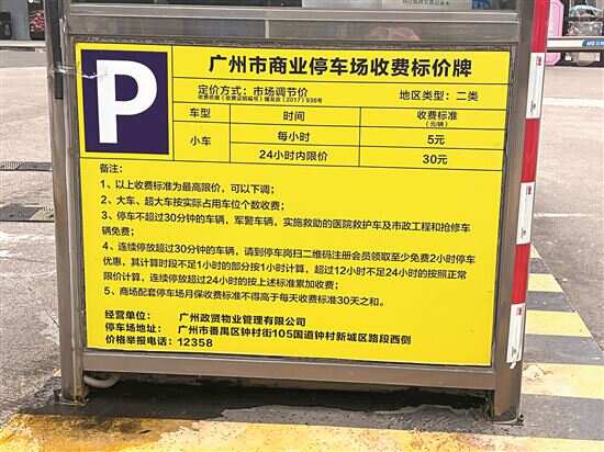 新快报记者走访发现停车费封顶为普遍现象。同样是黄色标价牌的自建停车场,如距祈福缤纷世界约3公里的雄峰国际美食文化广场,每小时收费5元,一天30元封顶;南国奥园小资天堂商业街每小时收费2元,一天20元封顶。在中心商业区,天河区的天河城广场一天80元封顶,太古汇商场则是一天128元封顶。